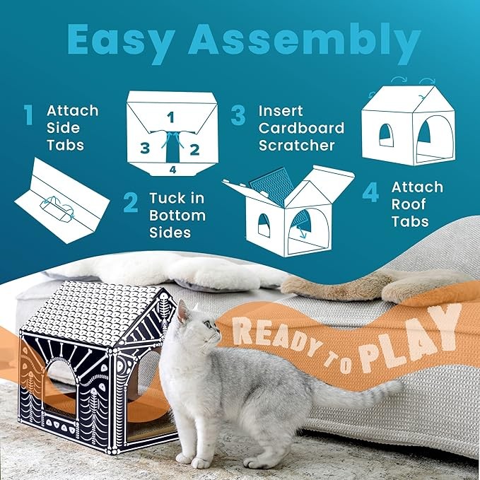 • [TOOL FREE ASSEMBLY]: This cardboard cat house is easy to assemble in just a few steps - no tools are required! (Assembly instructions will be included). It’s also fun for kids to play with as it encourages curiosity and creativity. The cardboard pieces easily and snugly fit into each other to create the complete cat house.